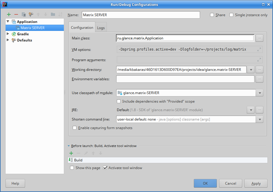 -Dspring.profiles.active=dev -Dlogfolder=~/projects/log/matrix